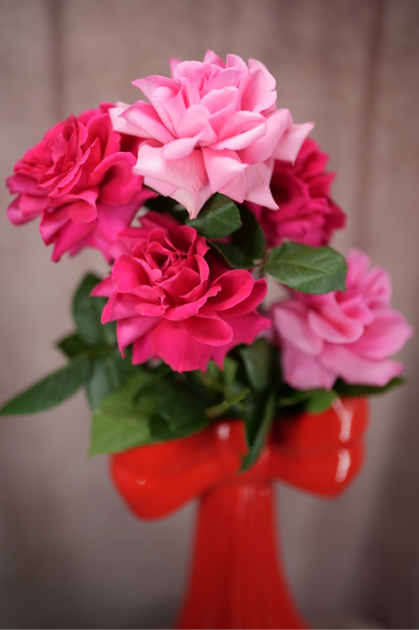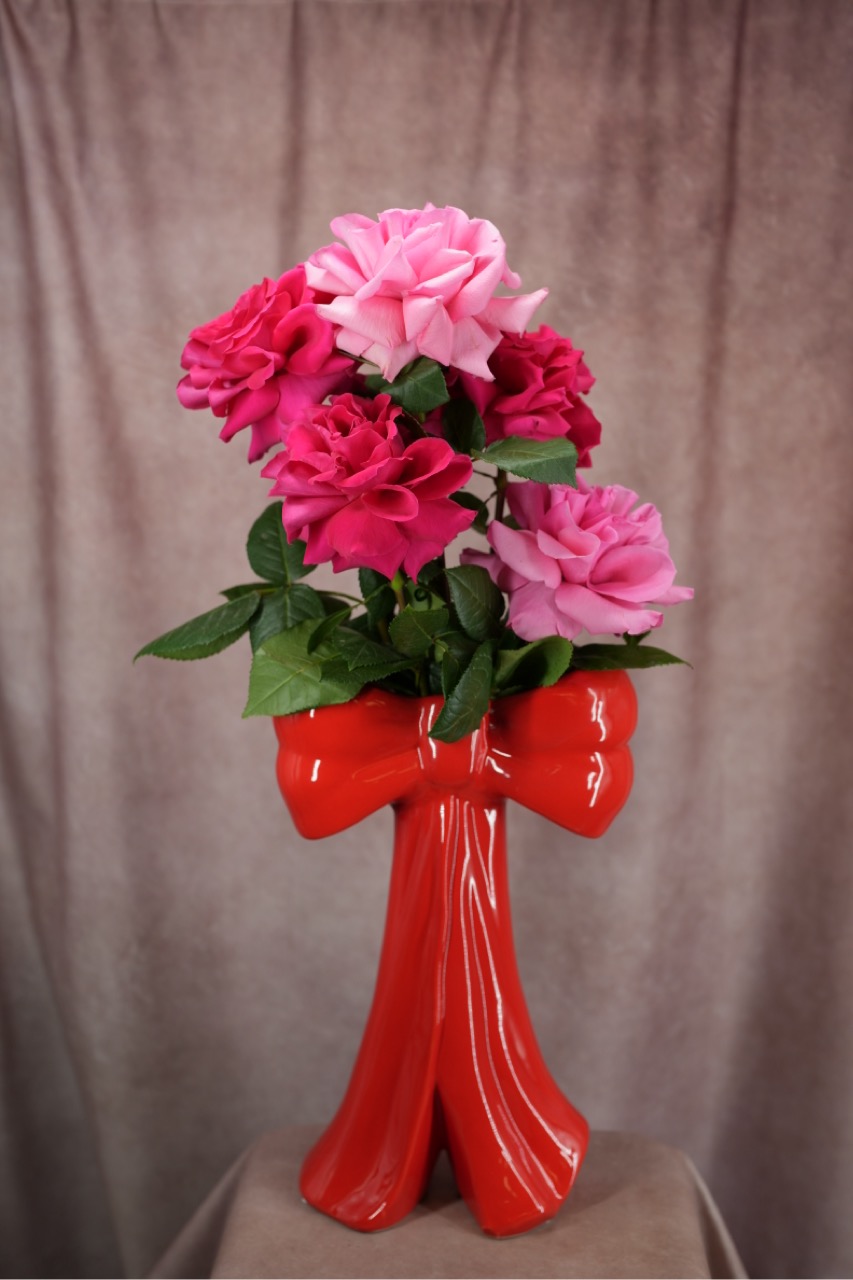 Skaistās rozes – Lielajā , sarkanājā bantes vāzē .