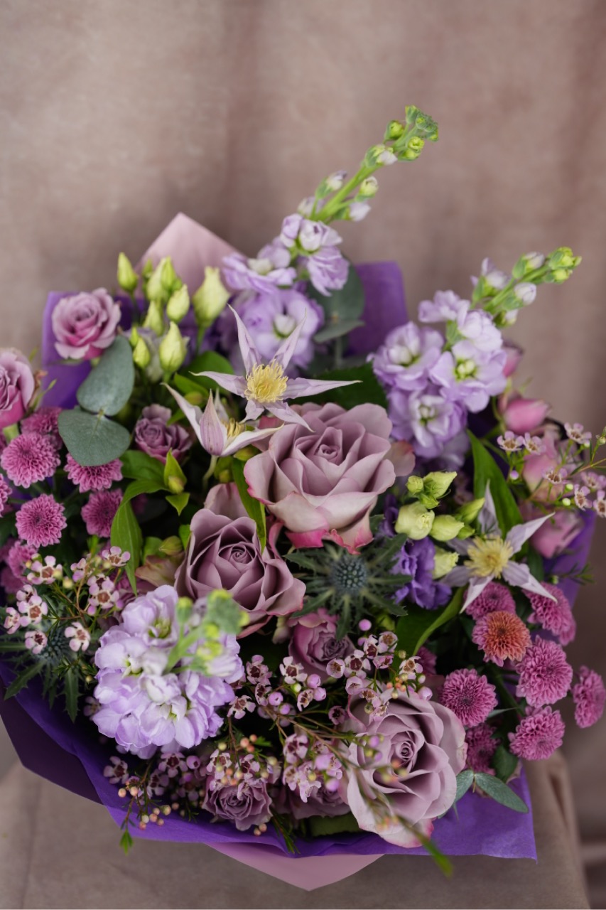 Violeti, lillā, dziļi dūmakaini toņi – sezonas ziedu salikums – violetā/lillā papīrā.
