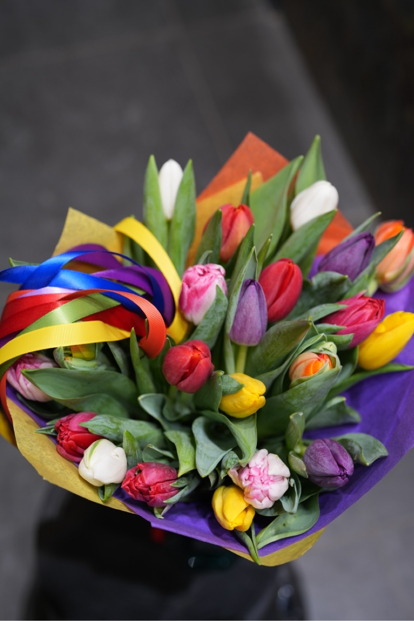 Krāsainas tulpes – 21gab. ar varavīksnes lentām tajā – ietītas krāsainā zīdpapīrā.
