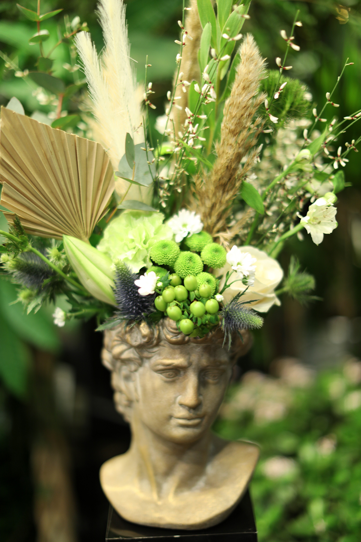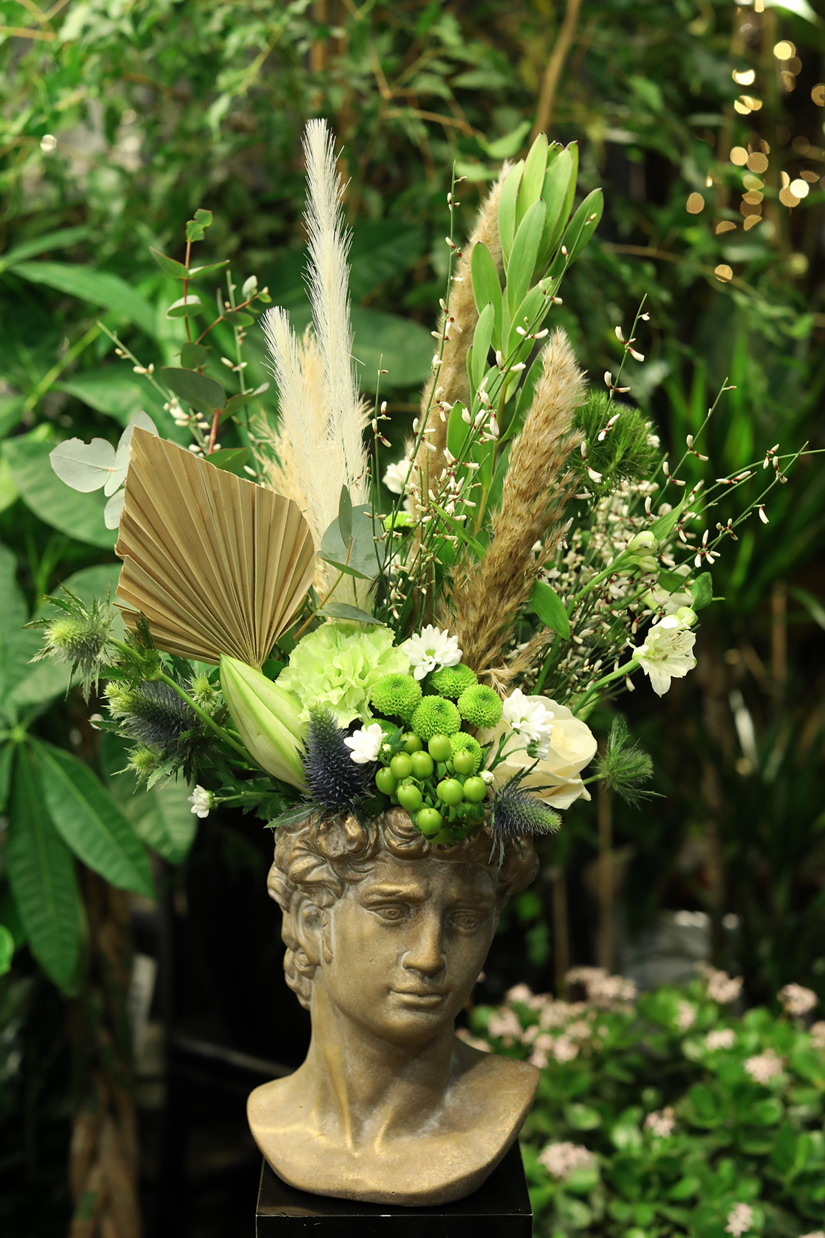 Ziedu un sauso ziedu kompozīcija – tumšajā vīriešu galvas vāzē ar zelta toni.